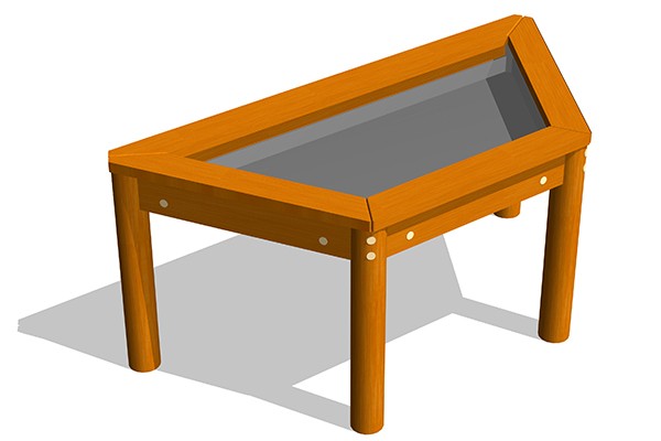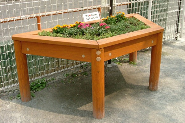 車椅子や立位で園芸作業ができる花壇です。台形なので組合せによって円形に配置したりできます。ウッドデザイン賞2016入賞。