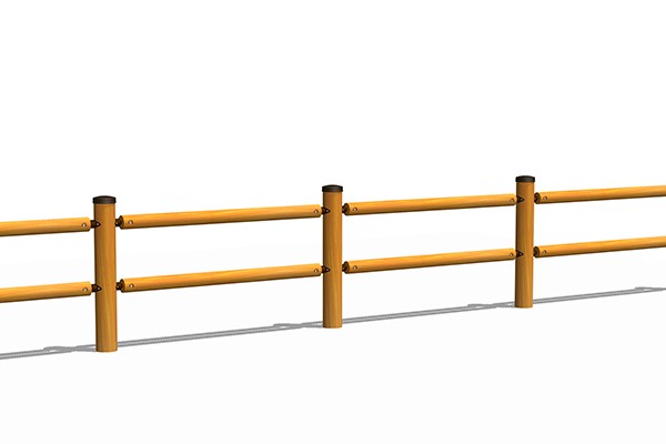 可動式接合金具「ユニバーサルジョイント」にて柱と横木を固定した勾配や曲部に対応できる木柵です。上下左右約25度まで対応可能です。