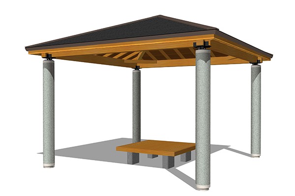 | 仕様 | 木部/杉材、柱/稲田擬石、屋根/ガルバリウム鋼板、座板/桧、ベンチ脚/PCコンクリート |