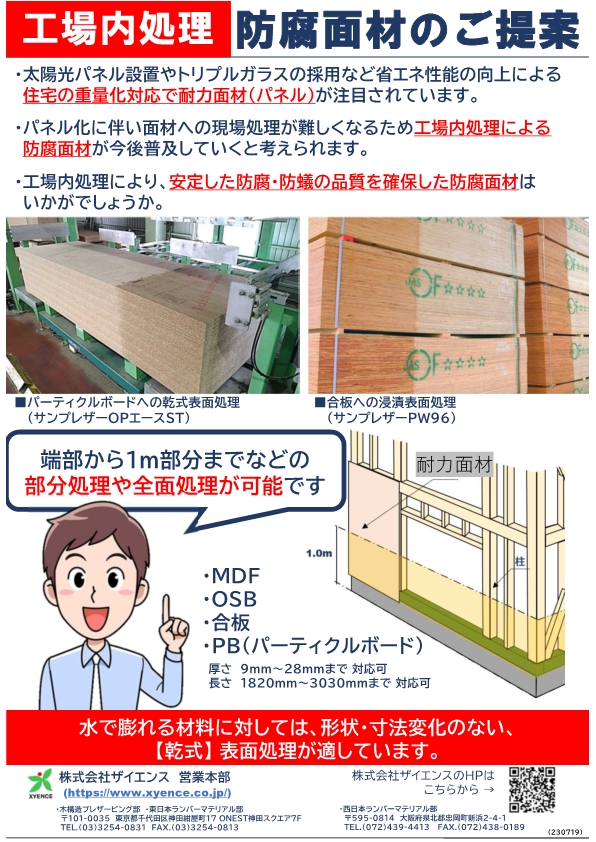 住宅用の耐力面材として用いる構造用合板にサンプレザーPW96で浸漬処理を行った住宅用保存処理面材です。GLから1mまでの範囲等の部分処理が可能です。現場処理と比較して、工程管理や品質管理の改善を図ることができます。