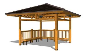 AF-079-30G+BE15H四季あずまや(縁台付き) 3000角、標準地域、ガルバリウム鋼板¥2,280,000 (税別)- 仕様 : 本体/杉材、接続金物/アルミ鋳物、屋根/ガルバリウム鋼板、座板/桧