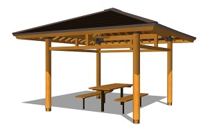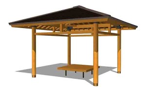 AF-079-30G+T18H四季あずまや(野外卓付き) 3000角、標準地域、ガルバリウム鋼板¥2,307,000 (税別)- 仕様 : 本体/杉材、接続金物/アルミ鋳物、屋根/ガルバリウム鋼板、座板/桧