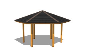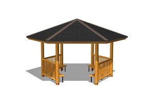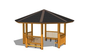 AFS-002B-G東屋(六角)ベンチ付¥3,400,000 (税別)- 仕様 : 本体/杉材、屋根/ガルバリウム鋼板、座板/桧、ベンチ脚/スチール