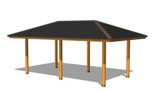 AFS-004B-G東屋(寄棟)ベンチ付¥3,900,000 (税別)- 仕様 : 本体/杉材、屋根/ガルバリウム鋼板、座板/桧、ベンチ脚/スチール