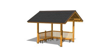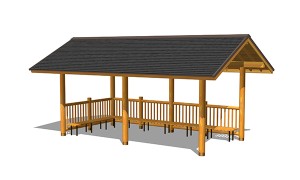 AFS-009B-54G東屋(切妻)ベンチ付¥3,410,000 (税別)- 仕様 : 本体/杉材、屋根/ガルバリウム鋼板、座板/桧、ベンチ脚/スチール