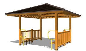 AFH-001ユニバーサルデザイン東屋 3000角、標準地域、ガルバリウム鋼板¥2,950,000 (税別)- 仕様 : 本体/杉材、屋根/ガルバリウム鋼板、座板/桧