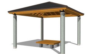 AFS-008B-G擬石柱東屋(縁台付き) 3000角、標準地域、ガルバリウム鋼板¥3,326,000 (税別)- 仕様 : 木部/杉材、柱/稲田擬石、屋根/ガルバリウム鋼板、座板/桧、ベンチ脚/PCコンクリート