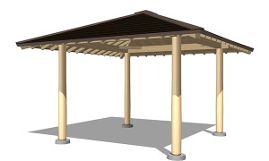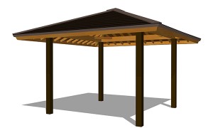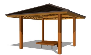 AFS-012B鋼管柱東屋(縁台付き) 3000角、標準地域、ガルバリウム鋼板¥2,690,000 (税別)- 仕様 : 柱/スチール、柱化粧材/杉材、屋根/ガルバリウム鋼板、座板/桧、ベンチ脚/スチール