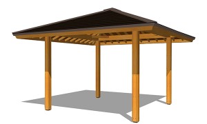 AFS-012鋼管柱東屋 3000角、標準地域、ガルバリウム鋼板¥2,420,000 (税別)- 仕様 : 柱/スチール、屋根/ガルバリウム鋼板、木部/杉